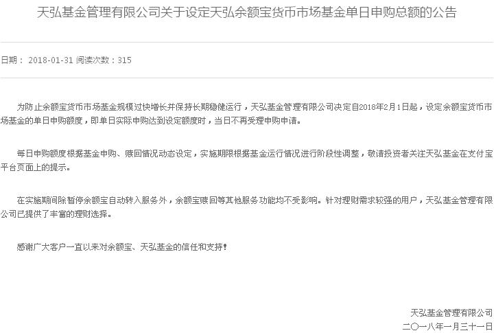 天弘基金今日發布公告稱,自2月1日起,將設置餘額寶每日申購總量,即單日實際申購達到設定額度時,當日不再受理申…