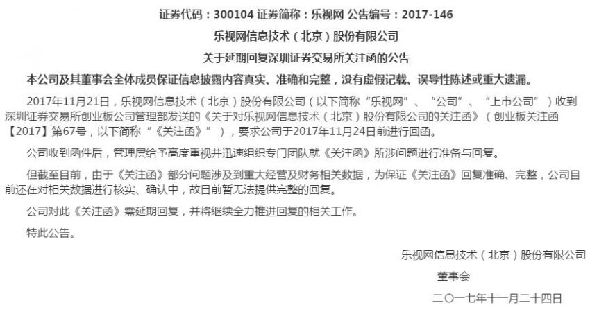 樂視網:延期回復深交所關注函