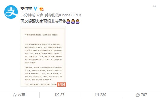 10月23日消息,《電商報》獲悉,支付寶官方微博發布公告稱,在近期發現一些非法網貸公司悄悄轉入地下,為推廣自己…