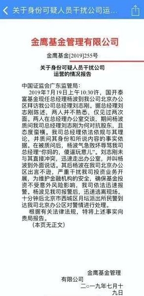摘要 【金鷹基金總經理公司內“被辱罵” 情況說明公文泄露背後 隱情正慢慢浮現】7月19日,一則金鷹基金向廣東證…