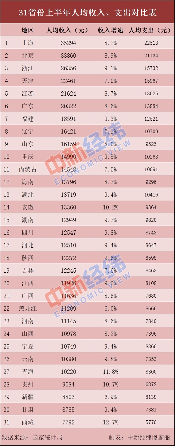 上半年居民收支對比:9省份收入跑贏全國 這些省份“會賺也會花”