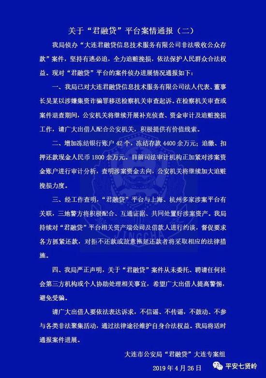 4月26日消息,大連市公安局今日通報P2P平台案件進展。君融貸法人代表、董事長吳雋被以涉嫌集資詐騙罪移送檢察機…