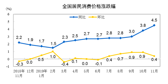 統計局:11月CPI同比增4.5% 租賃房房租環比下降0.3%