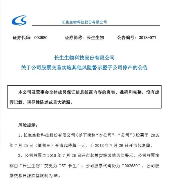 長生生物被ST 全面停產或存退市風險