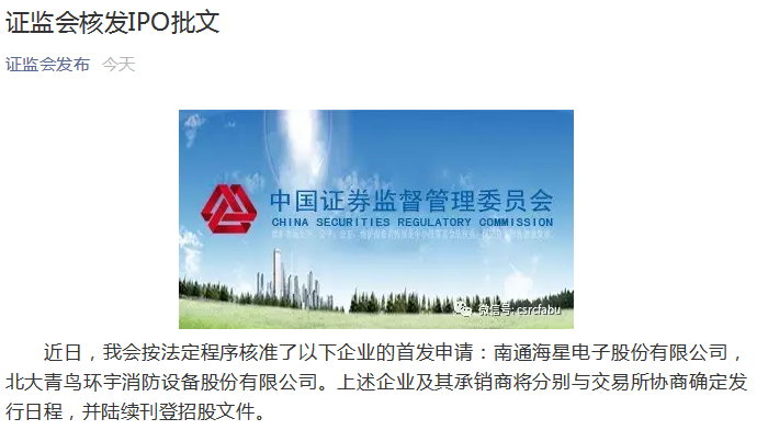摘要 【證監會核發2家企業IPO批文】近日,我會按法定程序核准了以下企業的首發申請:南通海星电子股份有限公司,…