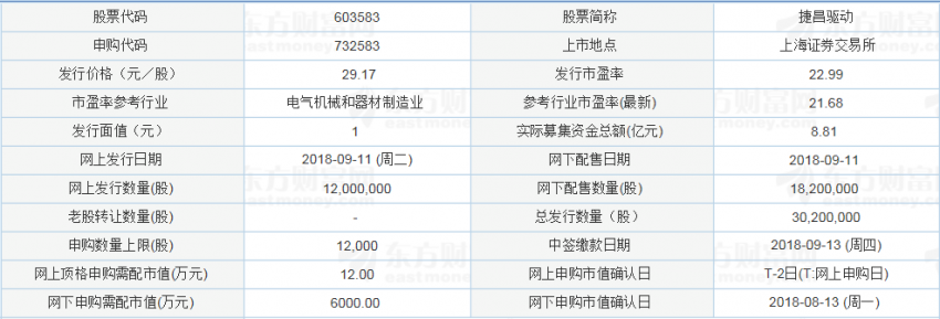 新股提示:捷昌驅動9月11日申購 頂格需配市值12萬