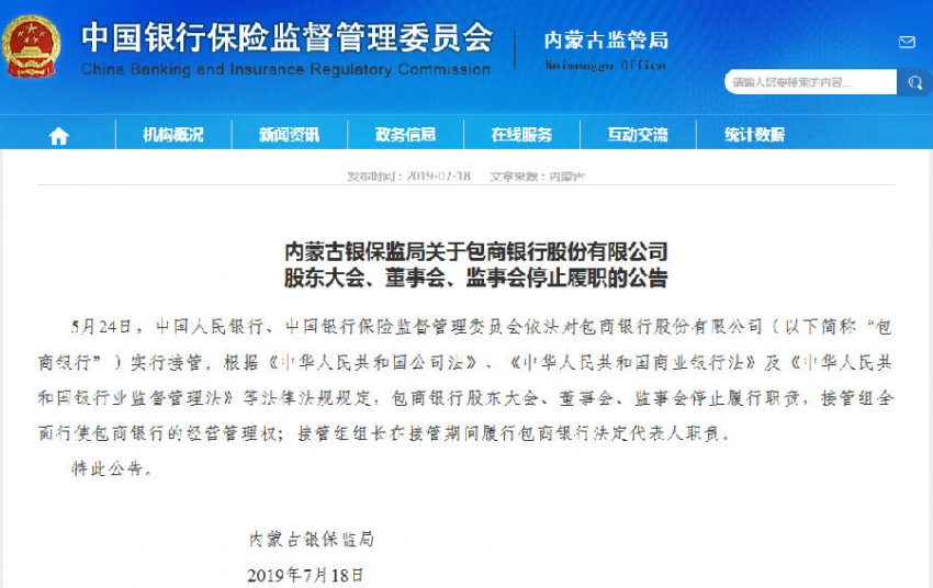 內蒙古銀保監局:包商銀行股份有限公司股東大會、董事會、監事會停止履職