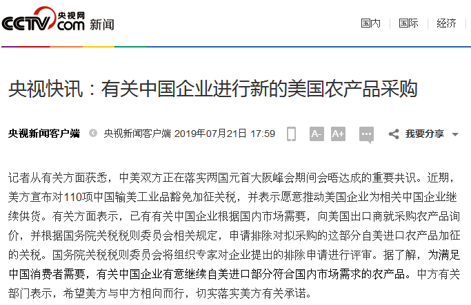 摘要 【央視:有關中國企業進行新的美國農產品採購】據了解,為滿足中國消費者需要,有關中國企業有意繼續自美進口部…