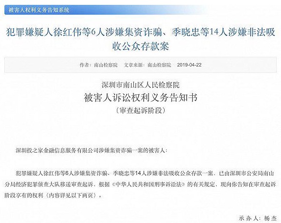 4月23日消息,深圳南山區檢察院網站昨日公開显示,犯罪嫌疑人徐紅偉等6人涉嫌集資詐騙、季曉忠等14人涉嫌非法吸…