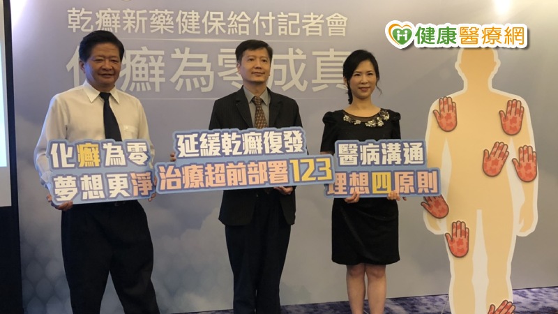 左 乾癬病友盧先生. 中 台灣乾癬暨皮膚免疫學會理事長暨台大醫院皮膚部主任 蔡呈芳教授. 右 台灣乾癬暨皮膚免…