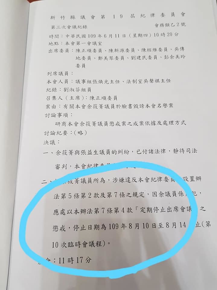摘錄自2020年6月18日中央社報導 新竹縣議會昨天(17日)開第9次臨時會,在紀律委員會討論綠黨籍議員余筱菁…