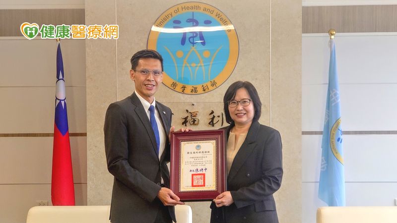 衛生福利部政務次長李麗芬(右側)接見蔡司台灣視力保健部暨醫療技術部總經理章平達(左側),頒贈感謝狀表達感謝之意…