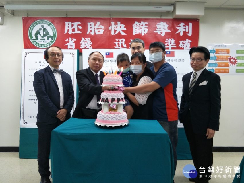 左起彰基醫院婦產部部長蔡鴻德部長、彰基醫院院長郭守仁、進行qPCR胚胎快篩數成功得子的蔡小姐、小孩、先生、基因…