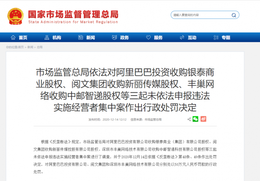 違反《反垄斷法》 ,阿里、閱文、豐巢被頂格處罰