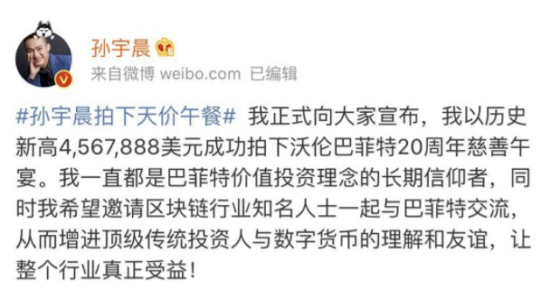 幣圈“大佬”拍下巴菲特午餐 股神曾公開唱衰比特幣