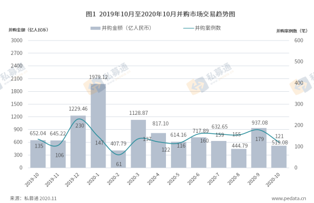 根據清科旗下私募通數據显示,2020年10月中國併購市場共完成121筆併購交易,數量環比下降32.4%,同比下…