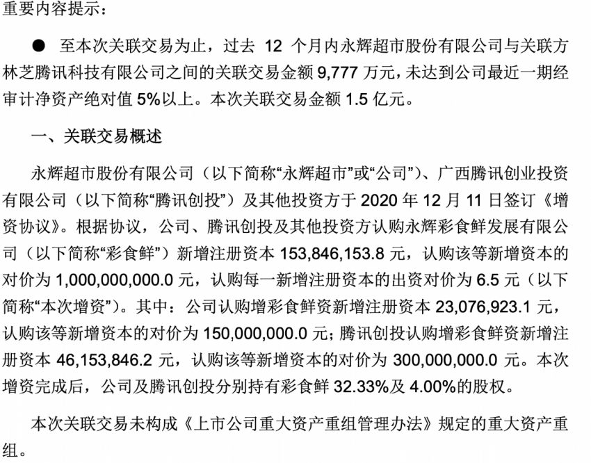 永輝超市公告稱,公司、騰訊創投及其他投資方認購永輝彩食鮮發展有限公司新增註冊資本1.54億元,認購該等新增資本…
